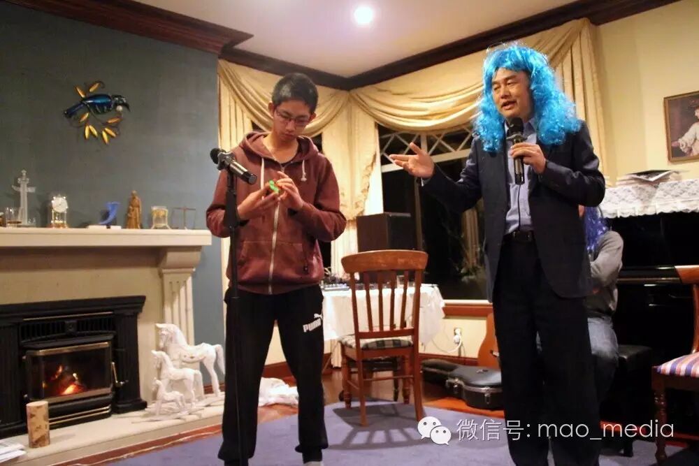 方华的儿子Gene Wang为大家做魔方表演。16岁的Gene 在魔方被打乱的情况下,用28秒就将魔方四个面都恢复为一色,国际记录据说是五、六秒。