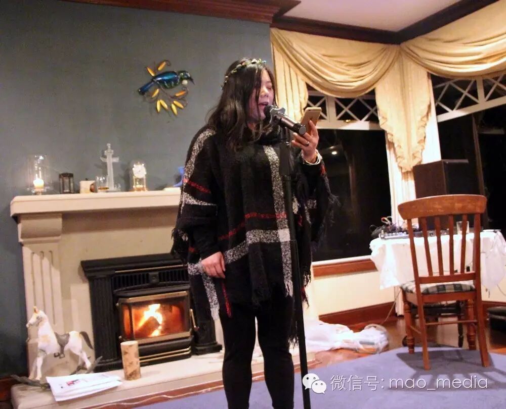 担任现场摄像的90 后女孩代欣竹初中时就开始写诗。她为大家朗诵了她创作的《我们终将分离,轮回也终将来临》。朗诵完毕,经营新西兰华文书店的方华向她赠送了礼物 – 书籍。