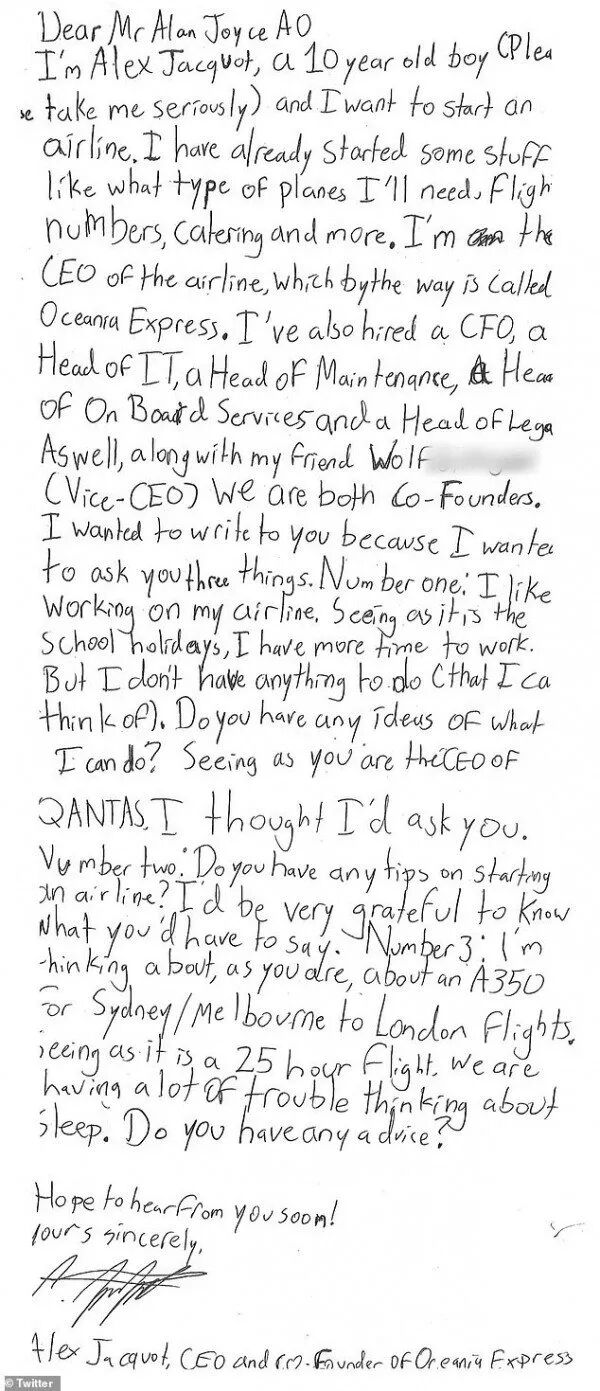 澳大利亚一名10岁的男孩子写了一封信给澳洲最大的航空公司Qantas的首席执行官Alan Joyce 先生,向他讨教如何经营航空公司。这个小男生信中要Joyce先生认真地对待他。