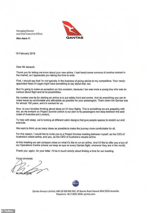 Qantas航空公司CEO的回信很认真、很有温情,也很幽默。