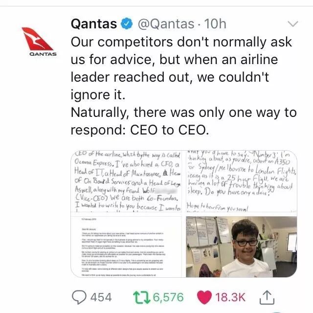 Qantas航空公司也在自己的推特上煞有介事地宣扬了此事,说:“ 我们的竞争者通常不会向我们讨要建议,但是当一家航空公司的领导人出面的话,我们不能视若无睹。