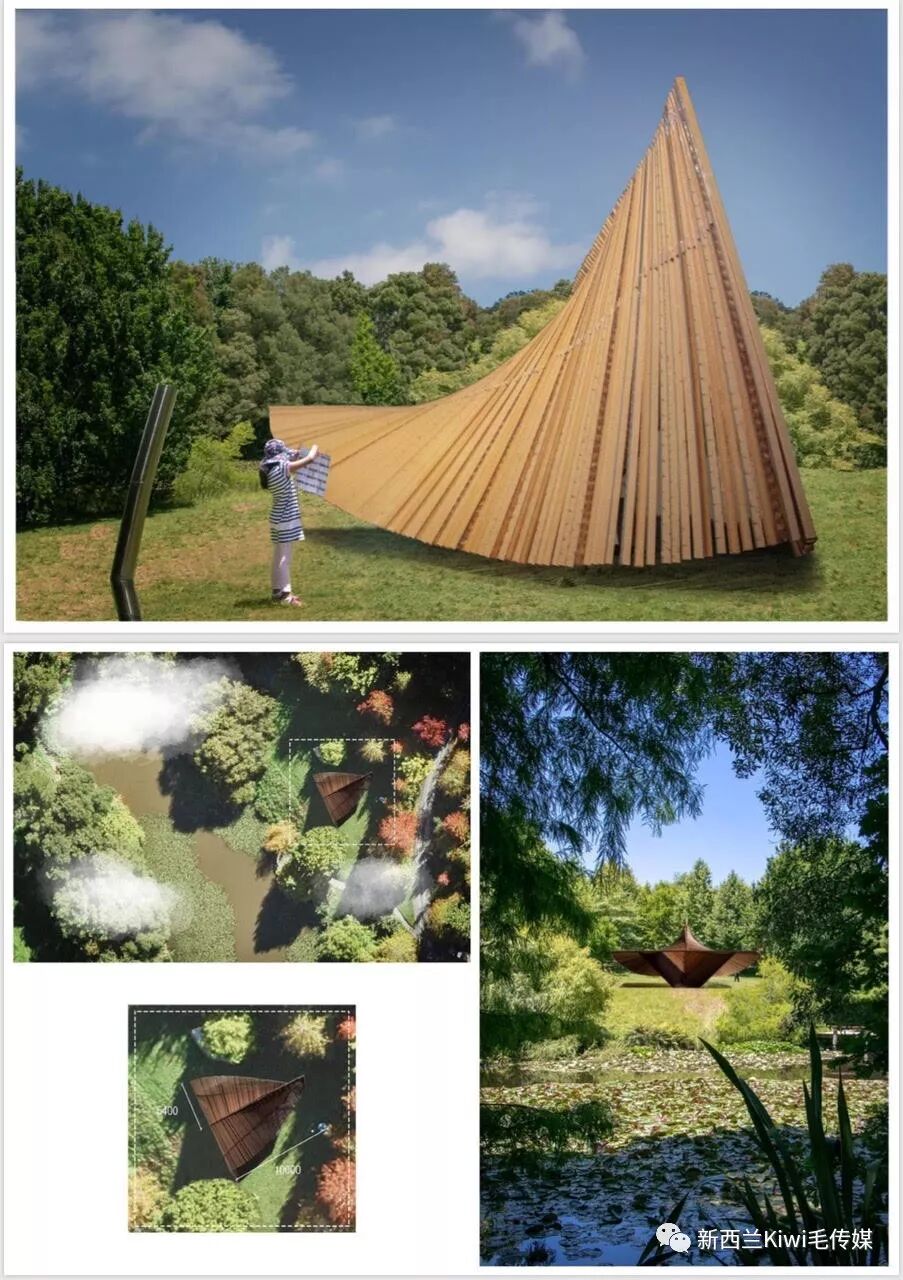 定欣还兴致勃勃地向我介绍了协会的另一位年轻会员Leo Zhu 的作品,Leo是奥克兰大学建筑系硕士班的学生,他的作品《木亭》(The Wooden Pavillon) 获得2019 Brick Bay Folly 新兴年轻建筑师大赛金奖,当地社区将依照建筑图在当地公园建一个木亭。
