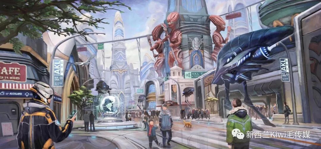 定欣说着,又给我看了Jacky Zheng 同学的另一幅作品,作品的名字很有意思,叫《乌托邦新西兰》(Utopian NZ),表现的是未来世界中的奥克兰街景。画面上有巨大的外星人雕像,怪兽和人类以及一只小狗共同行走在大街上,毫无违和感。