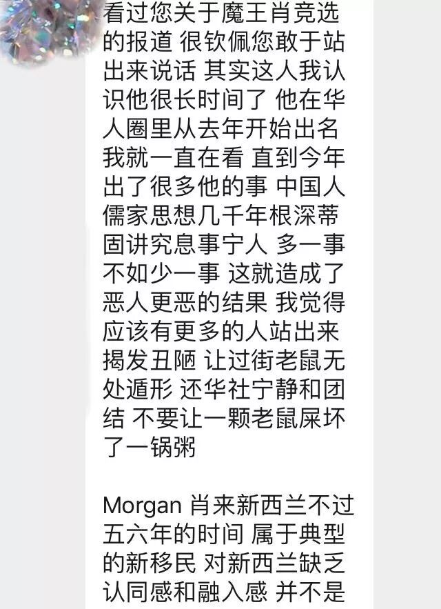 “看过您关于魔王肖竞选的报道 很钦佩您敢于站出来说话 其实这人我认识他很长时间了 他在华人圈里从去年开始出名 我就一直在看 直到今年出了很多他的事 中国人儒家思想几千年根深蒂固讲究息事宁人 多一事不如少一事 这就造成了恶人更恶的结果 我觉得应该有更多的人站出来揭发丑陋 让过街老鼠无处遁形 还华社宁静和团结 不要让一颗老鼠屎坏了一锅粥