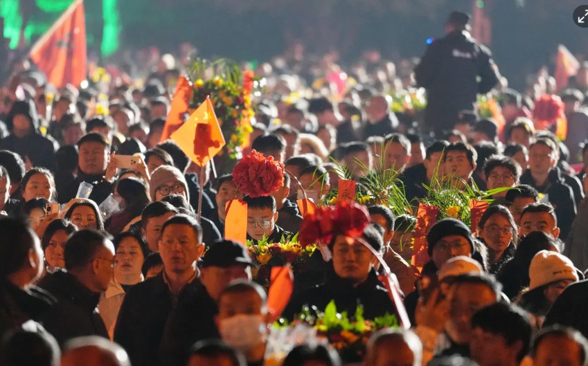 星期五(12月26日)是中共已故开国领导人毛泽东132周年诞辰纪念日。数以万计的中国民众从星期四(25日)晚开始陆续到毛泽东家乡湖南韶山,向毛泽东铜像鞠躬致敬。图为位于核心景区的毛泽东广场星期五当天人头攒动。 (中新社)