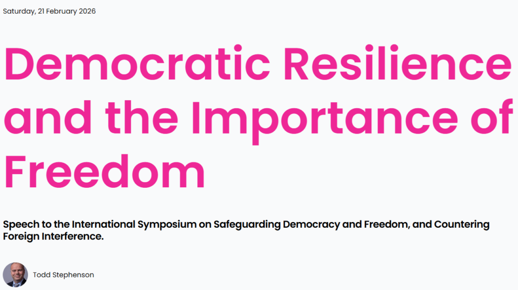 Speech to the International Symposium on Safeguarding Democracy and Freedom, and Countering Foreign Interference.